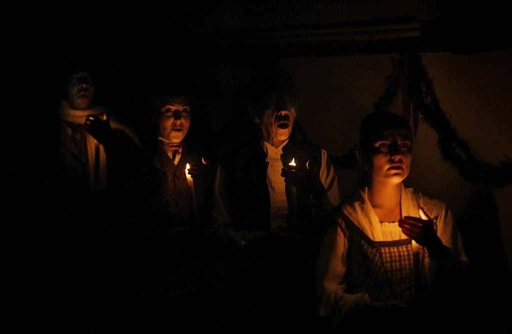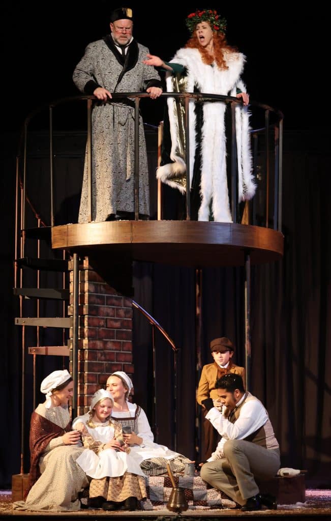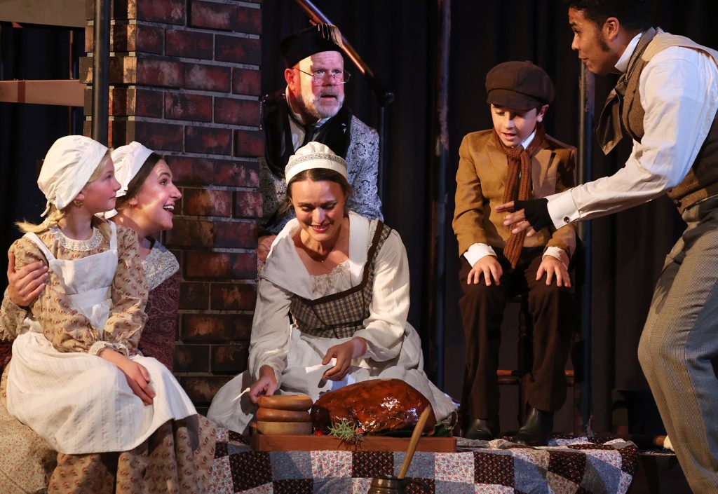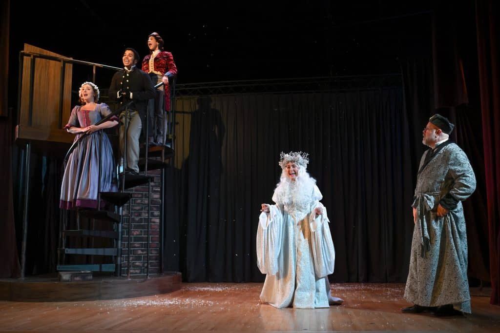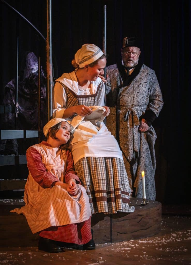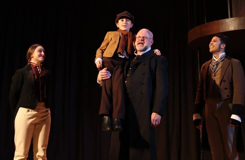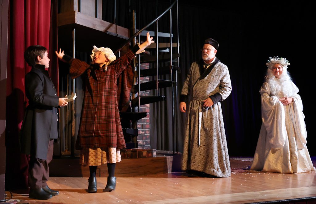 Lincoln Best (Child Scrooge) , Sigrid Breidenthal (Little Fan), Mike Ryan (Scrooge) and Andrea Sweeney Blanco (The Ghost of Christmas Past)